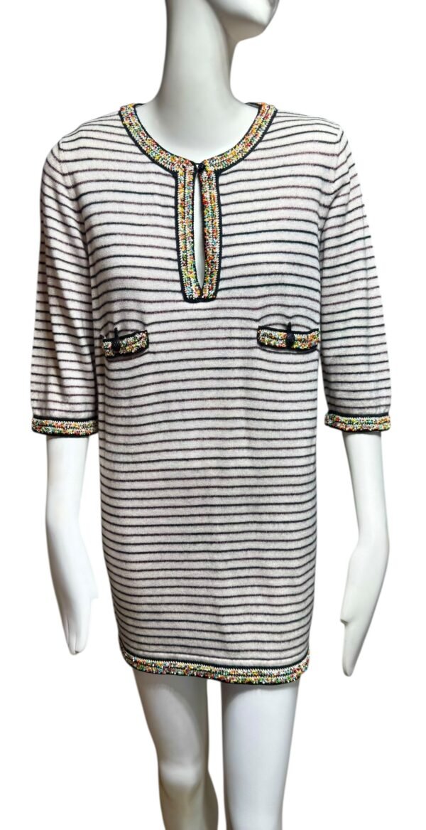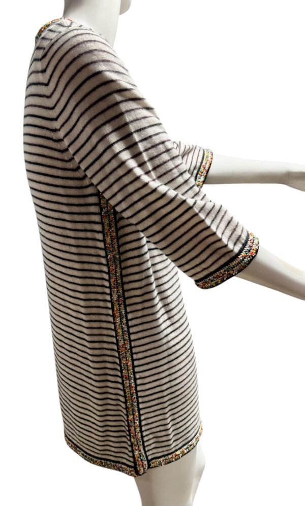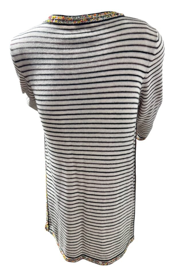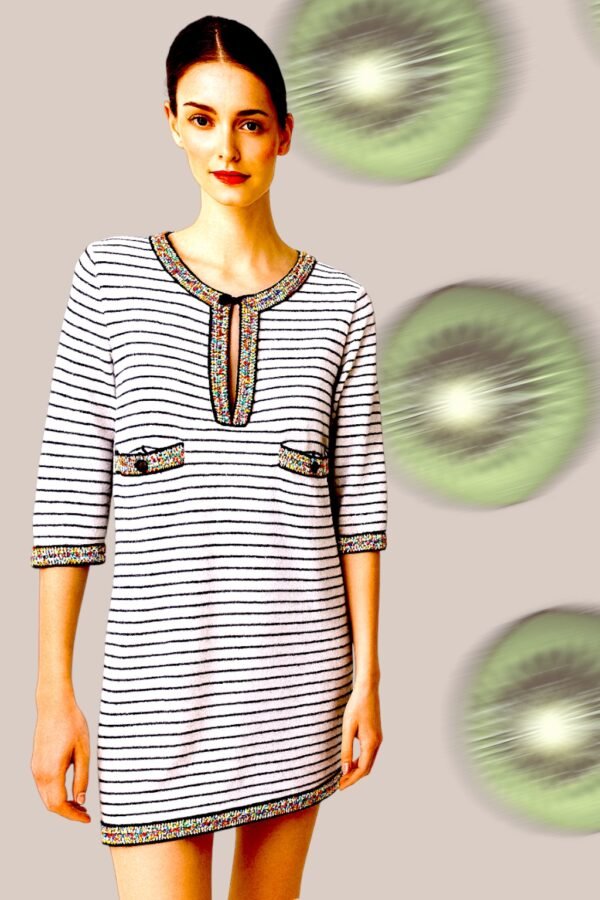 - Tunic in white with black stripes, offering timeless Parisian flair