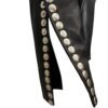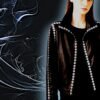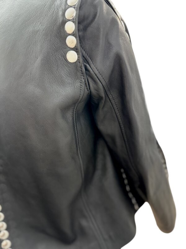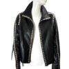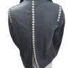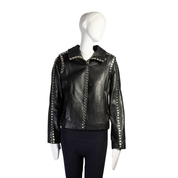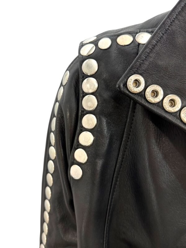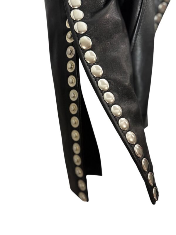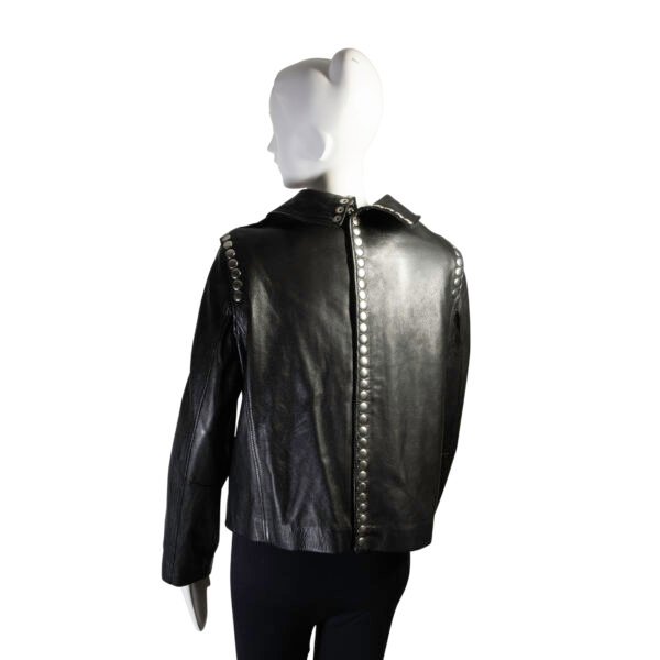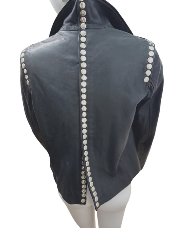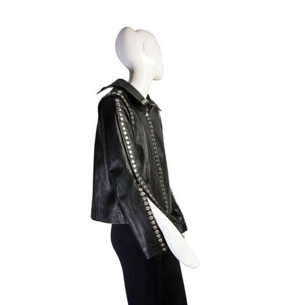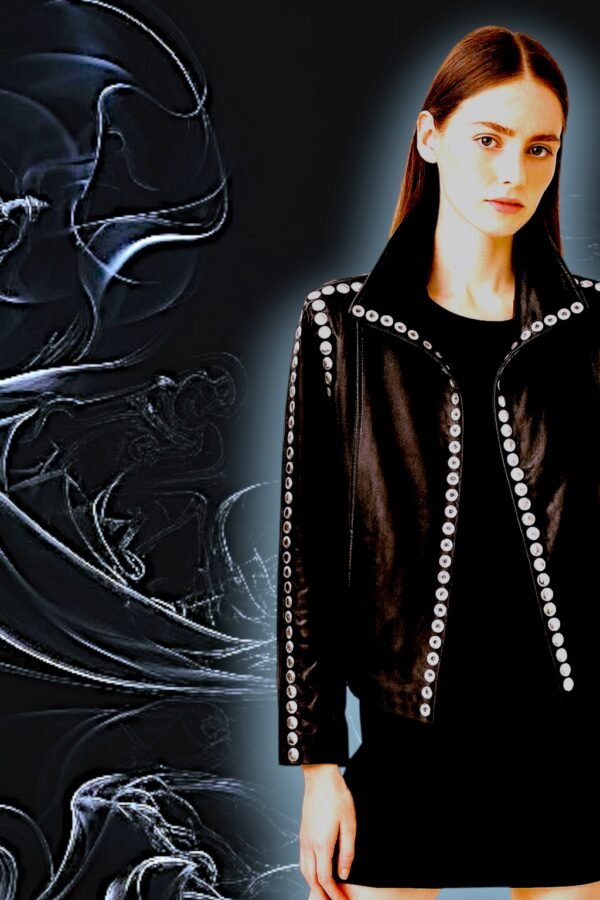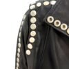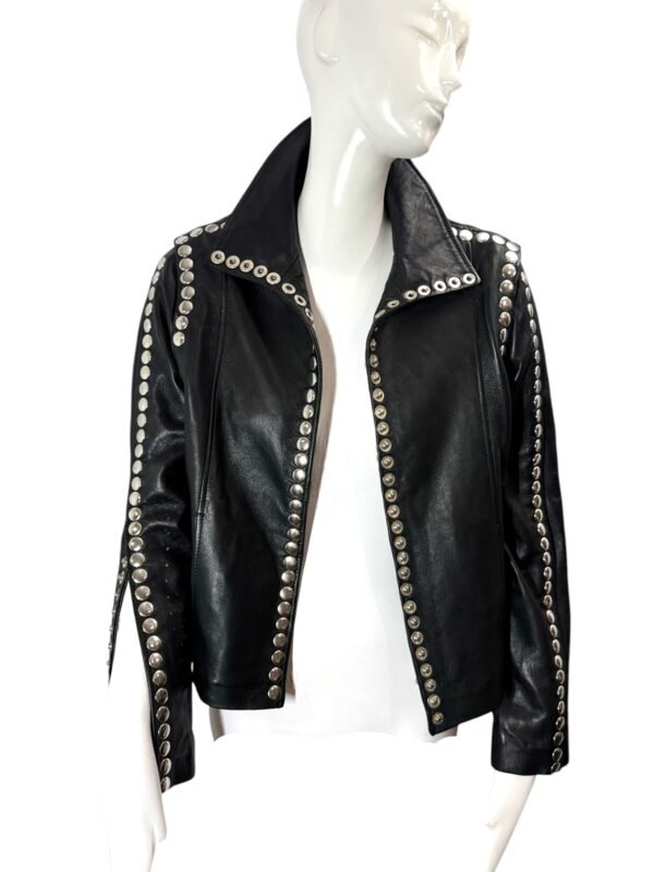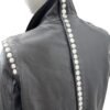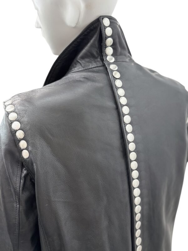 - High collar and edgy snap button detailing on the sleeves, back, and front
