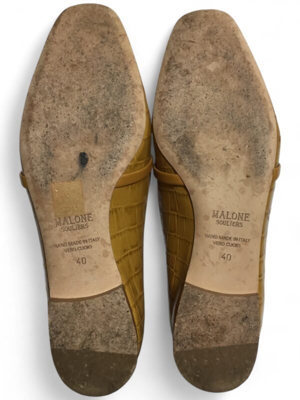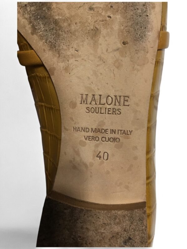 - Flat sole, almond toe, and signature vamp strap for elegant