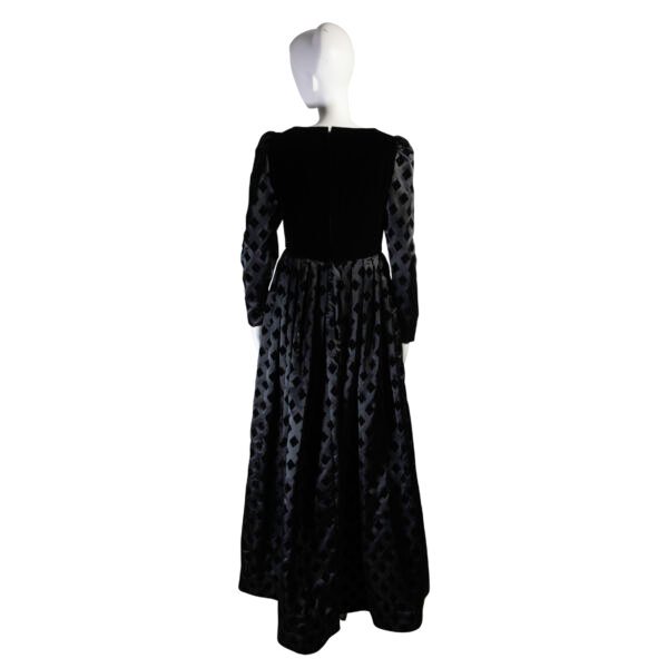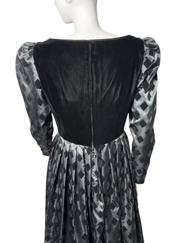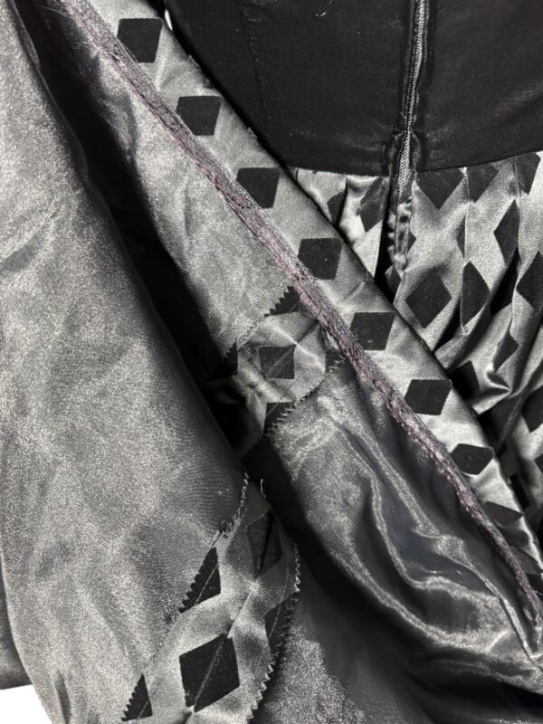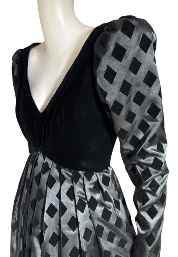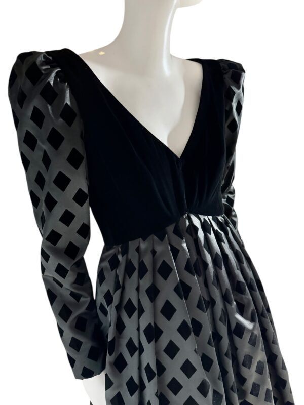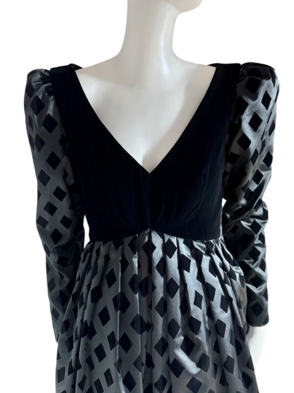 • Velvet bodice with gathered sleeves & diamond-shaped accents