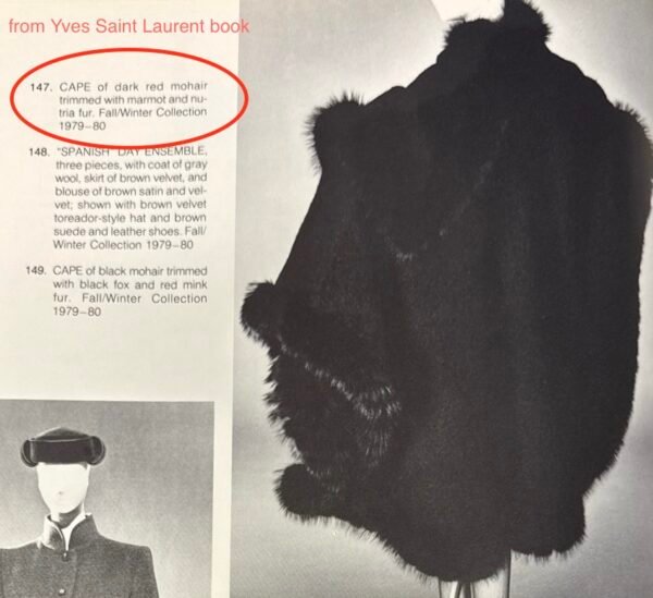 Collector’s Note: YSL’s 1970s collections often mixed luxurious materials with bold silhouettes, and this piece exemplifies that spirit. Its rarity, condition, and haute couture provenance make it a collector’s dream, especially given the continued global demand for vintage YSL. This particular garment was featured in the “Yves Saint Laurent” book published in connection with an exhibition at the Costume Institute of The Metropolitan Museum of Art, New York, from December 14, 1983, through September 2, 1984.